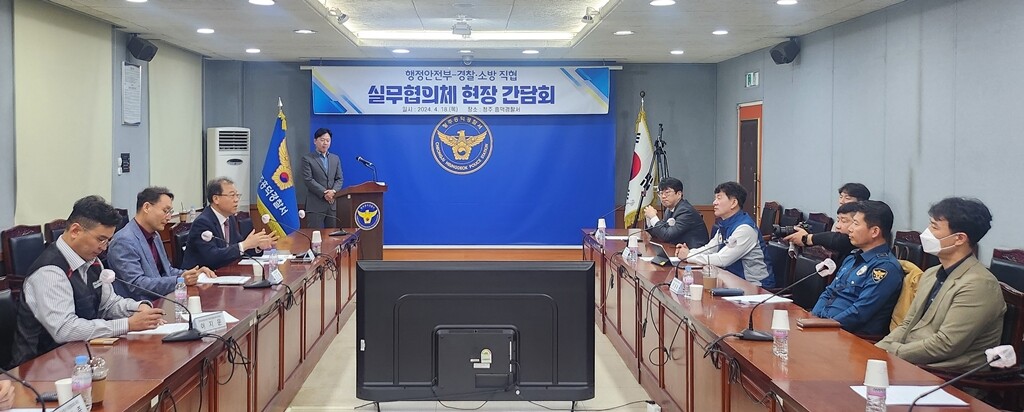 <행정안전부는 지난해 4월 18일 청주 흥덕경찰서에서 '경찰·소방직장협의회 실무협의체' 현장 간담회를 개최하고 경찰·소방공무원들의 애로 및 건의사항 등을 청취하고 의견을 나누고 있다.>