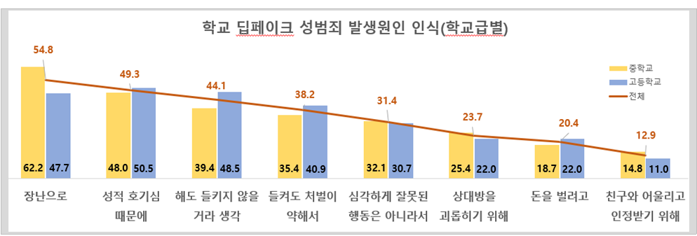 딥페이크 범죄 발생 원인으로는 ‘장난삼아’(54.8%)가 가장 많이 꼽혔고, ‘성적 호기심’(49.3%), ‘처벌이 약해서’(38.2%)가 그 뒤를 이었다. 이는 딥페이크 범죄가 심각한 범죄라는 인식이 부족한 현실을 보여준다.