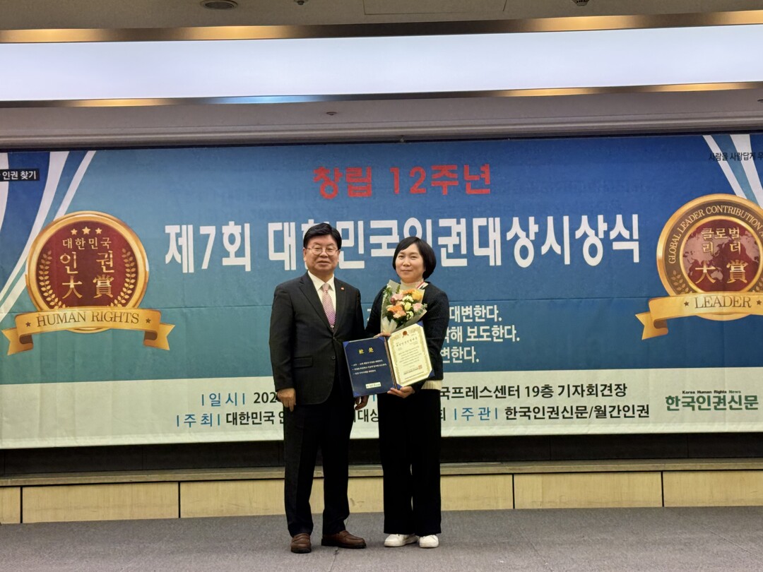 [피앤피뉴스=마성배 기자] 광주여성가족재단의 박태순 연구위원이 12월 27일 서울 한국프레스센터에서 열린 대한민국인권대상 시상식에서 ‘사회공헌·인권신장’ 부문을 수상했다. 박 연구위원은 여성과 아동의 권리 증진 및 사회적 돌봄 문제 해결에 헌신하며, 인권 분야에서 두드러진 공헌을 인정받았다.