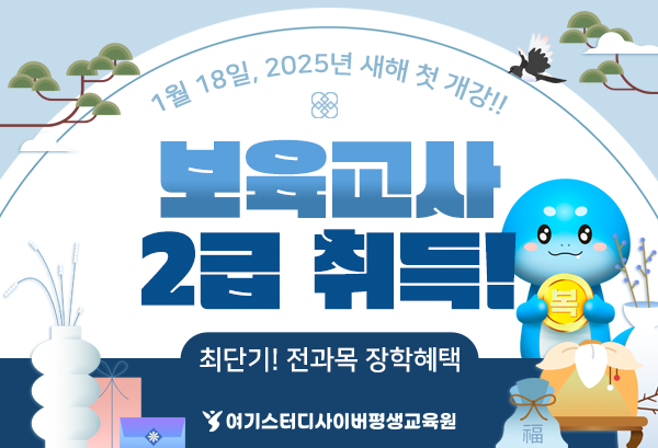 한편 여기스터디사이버평생교육원의 1월 18일 개강반에는 보육교사 2급 취득과정을 포함 총 7개 국가자격증 취득과정과 학사/전문학사 학위취득 과정이 동시에 개강한다.