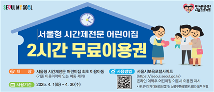 서울시는 시간제 전문 어린이집을 처음 이용하는 아동을 위해 4월 한 달간 2시간 무료 이용 이벤트도 진행한다.