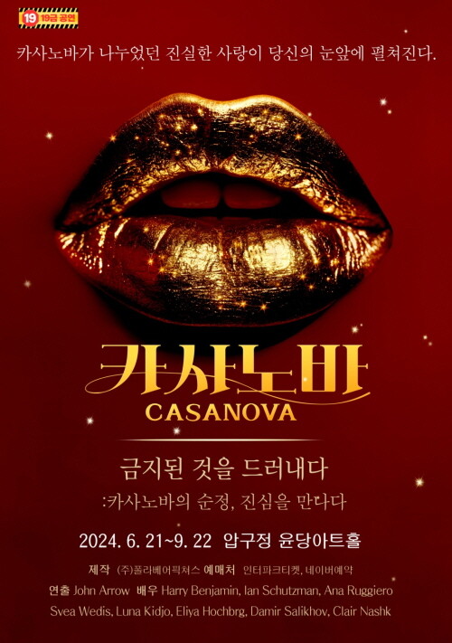 아름답고 가슴 저미는 카사노바와 로셀라의 러브스토리 연극 ‘카사노바’는 유쾌함과 재미를 더하는 수정 기간을 거쳐 7월 20일 재개막했다. 이후 9월 22일 일요일까지 압구정 윤당아트홀 1관에서 공연된다. 티켓 예매는 인터파크 티켓에서 단독 판매되며 관련 내용은 예매처 상세 페이지를 통해 확인이 가능하다.