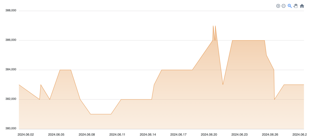 연간 금 매매 시세의 변화를 살펴보면, 지난 2023년 6월 말, 금 매매가(3.75g)는 30만 1,000원이었다. 그러다가 연간 8만 2,000원이 상승해 2024년 6월 말에는 38만 3,000원까지 매매가가 올랐다. 한편 백금을 제외한 18K, 14K, 은은 지난 5월에 비해 근소한 차이로 시세가 증가했다.