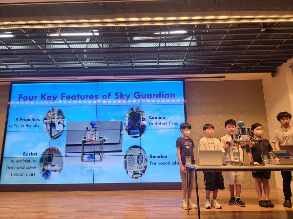 <사진-우송대학교 <디지털새싹우송대전> 참가학생들이 국제청소년로봇대회(IYRC) 창작종목에 참가하기 위해 영어로 발표를 하고 있다.>