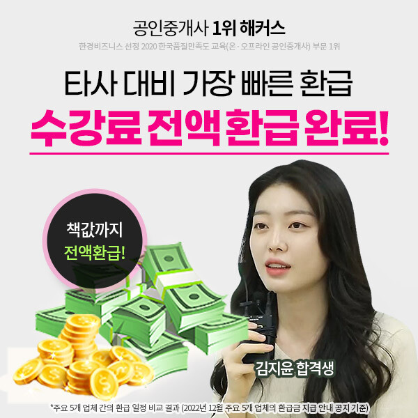현재 해커스 공인중개사에서는 2025년까지 합격 시 수강료를 100% 환급해주는 ‘2년 100% 환급반’을 운영하고 있다. 이와 관련된 자세한 사항은 해커스 공인중개사 사이트에서 확인할 수 있으며, 해커스 교육그룹은 해커스어학원, 해커스인강, 해커스공무원, 해커스경찰, 해커스소방, 해커스금융 등 다양한 브랜드를 통해 수험생들의 학습을 돕고 있다.