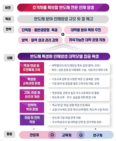 첨단산업 특성화대학 사업은 첨단산업 인재양성의 핵심 기반인 대학의 학사급 인재양성을 지원하는 사업이다. 반도체 특성화대학과 이차전지 특성화대학 지원사업 2개 분야를 대상으로 운영한다.
