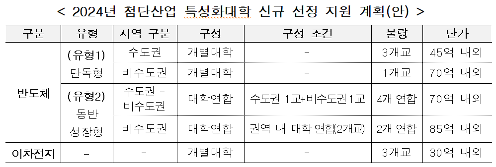올해는 수도권 7개교·비수도권 3개교 총 10개교를 반도체 특성화대학으로 선정해 총 655억 원을 지원한다. 또한 이차전지 특성화대학은 3개교를 선정하여 90억 원을 지원할 계획이다.