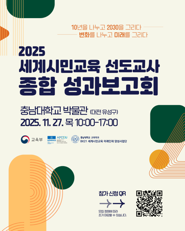 [피앤피뉴스=마성배 기자] 교육부와 유네스코아시아태평양국제이해교육원이 세계시민교육 추진 10년의 발자취를 총정리하는 자리를 마련한다. 두 기관은 11월 27일(목) 충남대학교 박물관에서 ‘2025년 세계시민교육 선도교사 종합 성과보고회’를 공동 개최한다고 밝혔다.