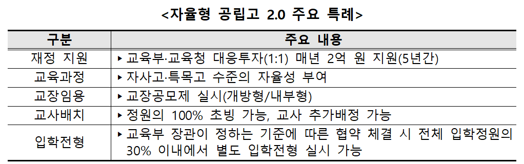 선정된 자공고 2.0 학교는 교육과정 설계 및 학사 운영 전반에 있어 높은 자율권을 갖게 된다. 예를 들어, 교장공모제를 통한 리더십 혁신, 교사 정원의 100%까지 초빙교사 배정, 추가 교사 배정 허용 등 기존 공립고에는 없는 유연한 운영이 가능하다.