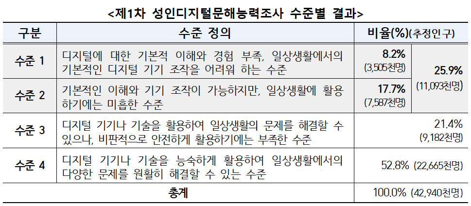 이번 조사는 성인의 디지털 이해와 활용 수준을 국가 차원에서 처음 측정한 것으로, 18세 이상 약 1만명을 표본으로 진행됐다. 영역은 △기본 활용 △정보 활용 △의사소통 △안전 △문제 해결 5개 분야이며, 특히 ‘문제 해결’ 부문은 지도앱 길 찾기, 기차표 앱 예매, 키오스크 주문, 카카오톡 활용, 은행 앱 송금 등 실제 생활 시나리오를 적용한 점이 특징이다.