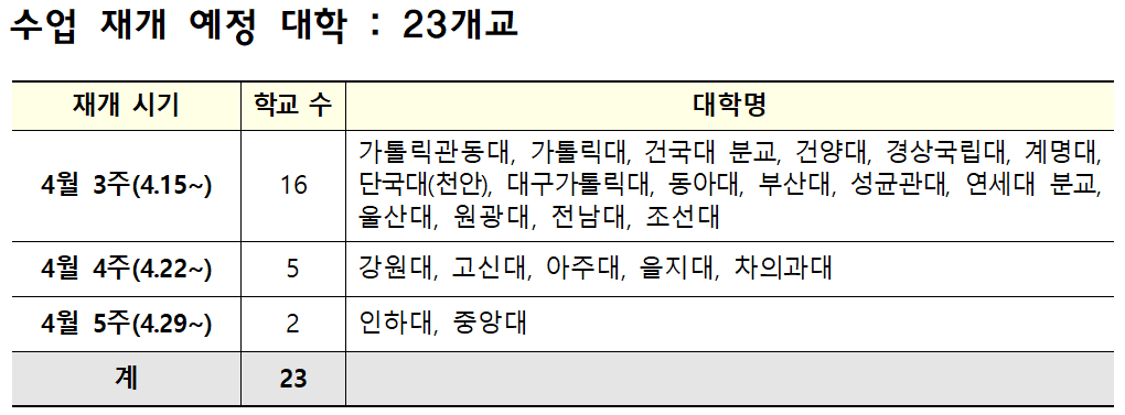 이달 15일부터는 16개 대학이 재개하고, 22일부터 4월 마지막 주까지는 7개 대학이 추가로 수업을 운영할 예정이다. 일정이 확정되지 않은 순천향대는 수업 재개를 위해 다각도로 노력하고 있다.
