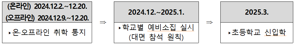 취학 대상 아동의 보호자에게는 12월 9일부터 20일까지 취학통지서가 우편 또는 인편으로 전달된다. 동시에, 정부24 누리집을 통해 온라인 취학통지서 발급 서비스도 제공된다. 다만, 모바일 앱에서는 해당 서비스가 제공되지 않아 누리집을 이용해야 한다.
