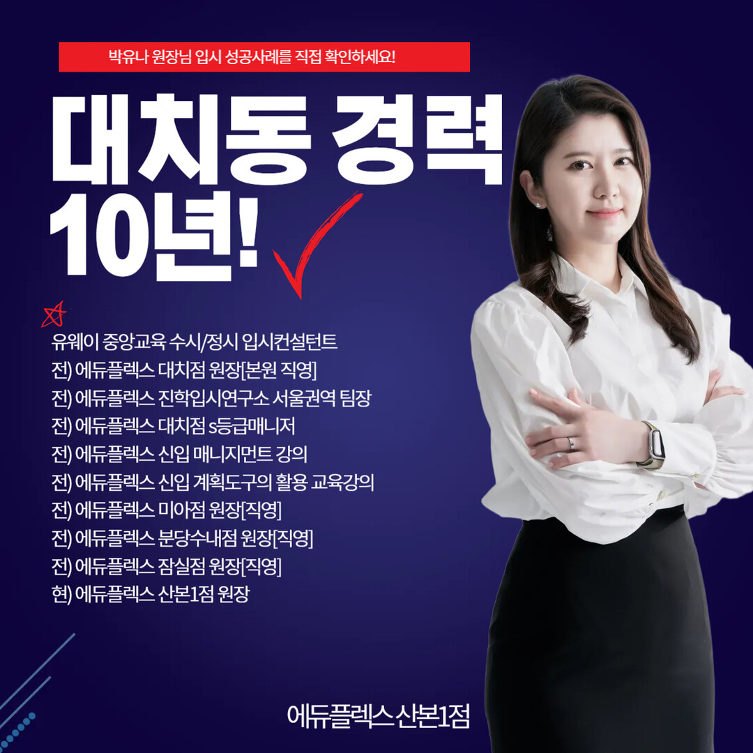에듀플렉스 산본1점의 박유나 원장은 에듀플렉스 대치점 원장, 진학입시연구소 서울권역 팀장, 분당수내·잠실·미아점 원장 등 다수의 본사 직영센터를 총괄해온 입시 전문가로, 10년 이상 에듀플렉스 현장을 지켜온 베테랑이다. 유웨이 중앙교육 입시컨설턴트로도 활동한 바 있으며, 에듀플렉스 신입 매니저 대상 교육 강의와 학습계획 도구 활용법 강의 등 내부 교육까지 맡아왔다.