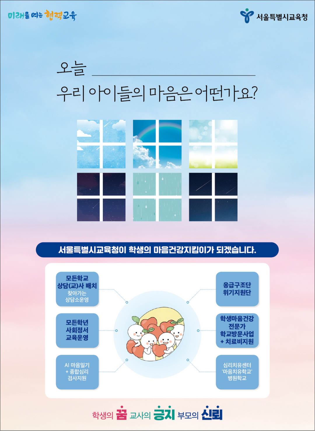 캠페인에는 ▲모든 학교 상담(교)사 배치 ▲전 학년 사회정서교육 운영 ▲서울학생통합콜센터 및 응급지원단 운영 ▲심리정서치유센터 ‘마음치유학교’ 구축 등 ‘서울 학생 마음건강 증진 사업’의 핵심 정책이 집중 소개된다.