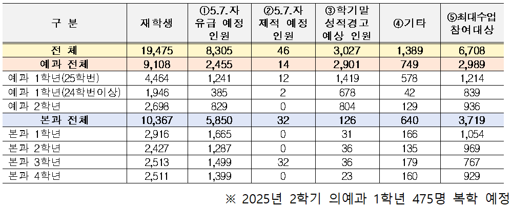 예과와 본과를 나눠 보면 예과생은 전체 9,108명 중 2,455명이 유급 처리됐고, 14명이 제적 대상이다. 예과 과정 특성상 성적경고 예상 인원도 2,901명에 이르며, 2학기 정상 수업 참여가 가능할 것으로 보이는 예과생은 2,989명으로 파악됐다. 본과에서는 1만367명 중 절반에 가까운 5,850명이 유급되고, 32명이 제적될 예정이다.