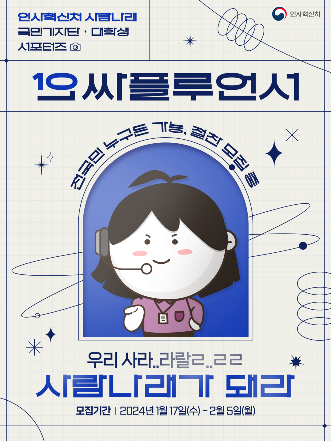 최종 합격자는 2월 15일 인사혁신처 SNS채널 공지 및 개별전화로 안내할 예정이다. 자세한 내용은 사람나래 운영사무국(070-4006-8140)으로 문의하면 된다.