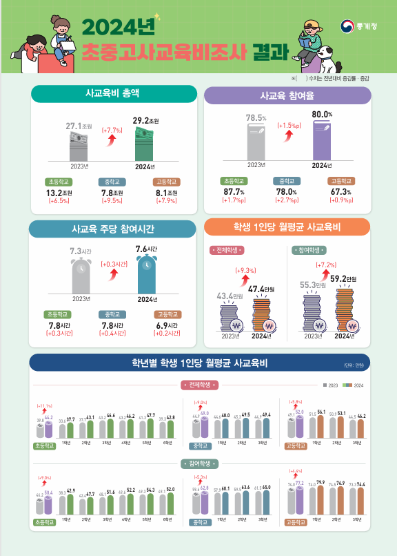 또한, 학생 1인당 주당 평균 사교육 참여 시간도 7.6시간으로 전년 대비 0.3시간 늘었다. 특히 초등학생의 사교육 참여 시간이 가장 길었으며, 학년이 올라갈수록 학습 과목 중심의 사교육이 증가하는 경향을 보였다.