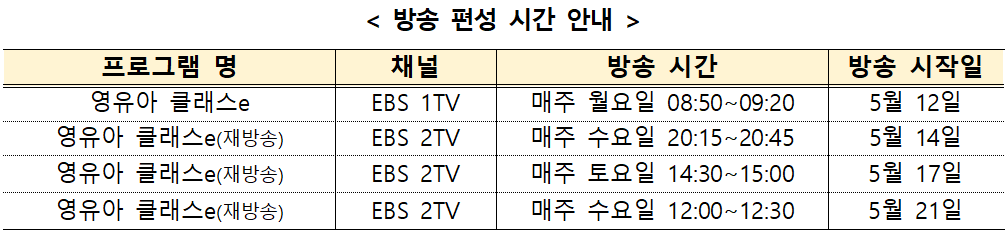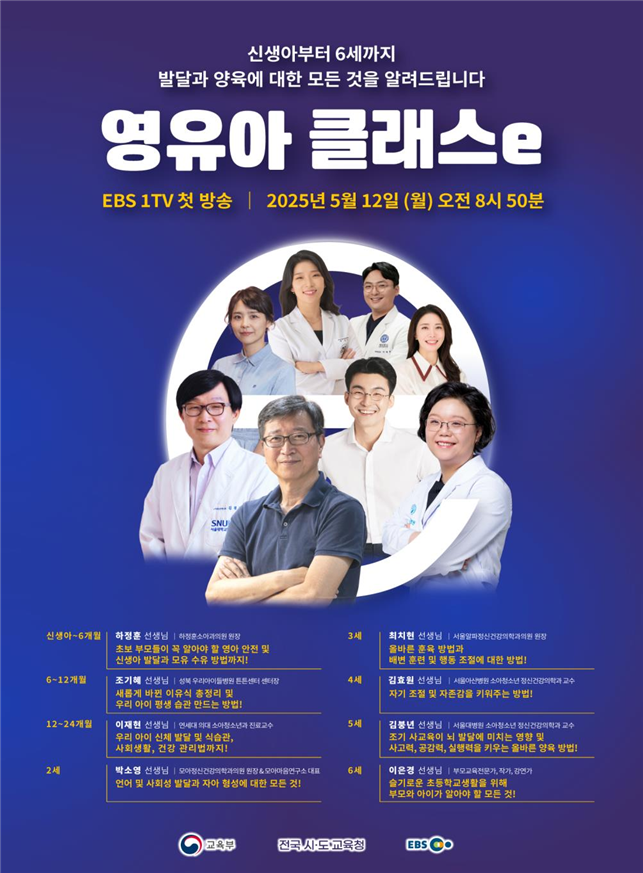 교육부(부총리 겸 장관 이주호)는 17개 시도교육청(경북교육청 주관), 한국교육방송공사(EBS)와 협력해 제작한 영유아 발달·양육 전문 콘텐츠 『영유아 클래스e』를 오는 5월 12일(월)부터 매주 방송한다고 밝혔다.