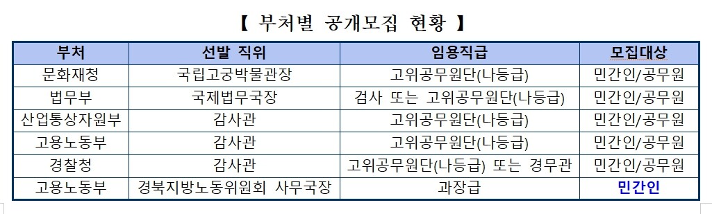 고위공무원단 직위는 문화재청 국립고궁박물관장, 법무부 국제법무국장, 산업통상자원부·고용노동부·경찰청 감사관 등이 포함됐고, 고용노동부 경북지방노동위원회 사무국장은 과장급으로 채용하며, 과장급의 경우 경력개방형 직위로 민간인만 응시가 가능하다.