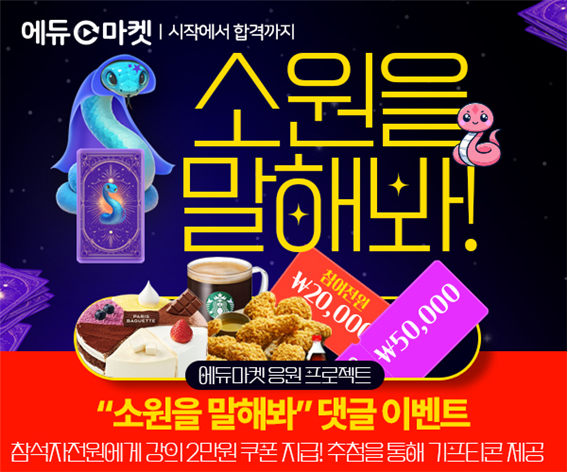 이번 이벤트는 에듀마켓 홈페이지에서 소원을 댓글로 남기는 간단한 방법으로 참여할 수 있으며, 푸짐한 상품과 강의 쿠폰이 제공된다.
