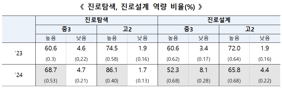 진로성숙도 항목에서는 진로탐색 역량은 중3과 고2 모두 유의미하게 증가했지만, 진로설계 역량은 동반 하락했다. 이는 장래 직업이나 진로에 대한 관심은 높아졌지만, 구체적인 실행력이나 준비도는 여전히 부족함을 시사한다.