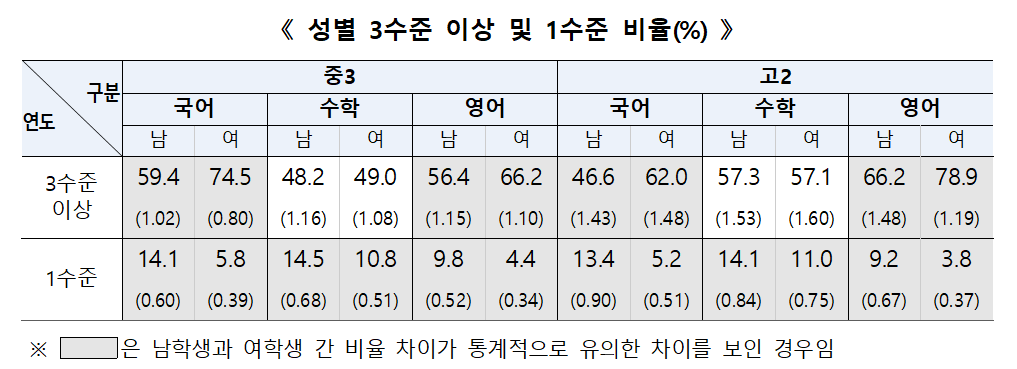 성별 비교에서는 국어와 영어에서 여학생의 3수준 이상 비율이 남학생보다 높았고, 1수준 비율은 모든 교과에서 여학생이 낮은 것으로 분석됐다. 특히 중·고등학교 공통으로 여학생의 학업 성취도가 안정적인 양상을 보였다.