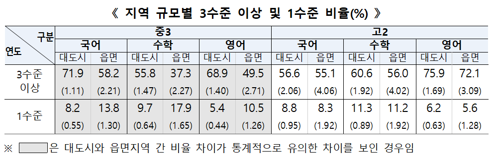 지역 규모별 분석 결과, 중3의 경우 모든 교과에서 대도시 학생이 읍면 지역보다 성취도가 높았으며, 기초학력 미달 비율도 읍면 지역이 상대적으로 높게 나타났다. 반면, 고2는 지역 간 유의미한 차이를 보이지 않아 지역별 학력 격차는 중학교 단계에서 더 뚜렷한 것으로 드러났다.