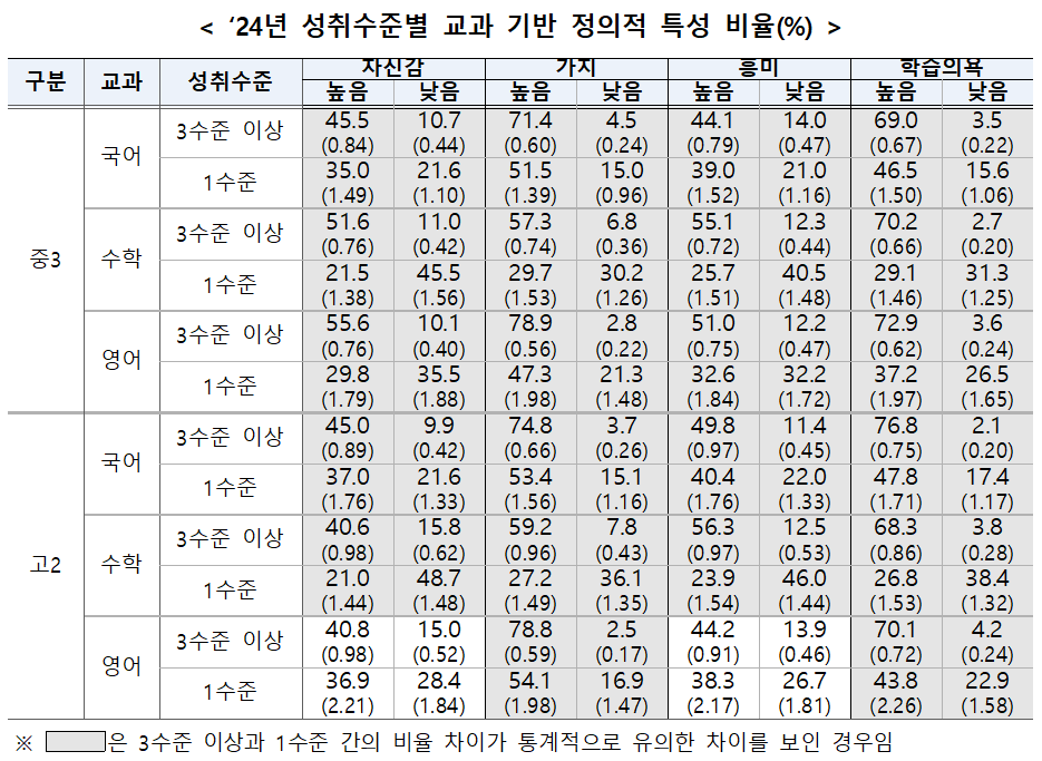 특히 성취수준이 높을수록 교과에 대한 자신감과 흥미, 가치, 학습의욕이 모두 높은 경향을 보였으며, 중3과 고2 모두 수학에서 가장 큰 차이가 확인됐다.