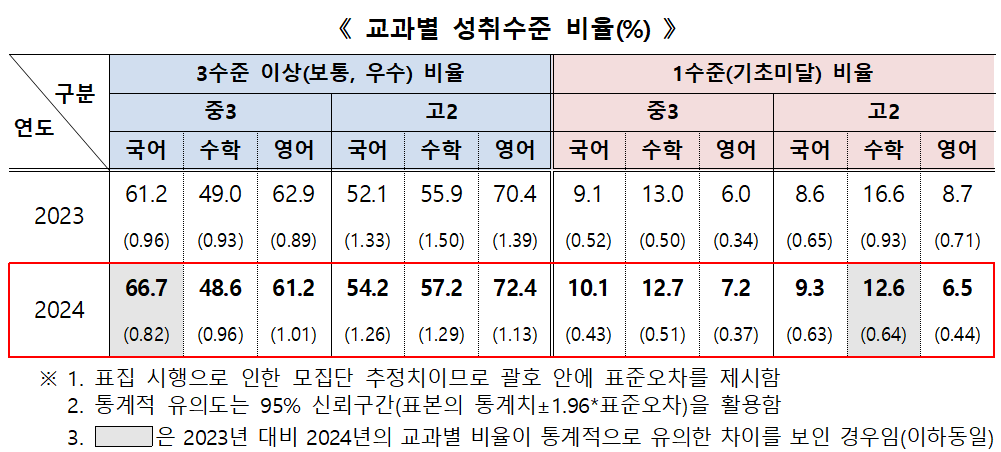 교과별 성취도 분석 결과, 중3 국어의 3수준(보통학력) 이상 비율은 66.7%로 전년 대비 5.5%p 상승하며 유의미한 개선을 보였다. 고2 수학의 1수준(기초학력 미달)은 12.6%로, 전년 대비 4.0%p 감소해 기초학력 미달 학생 수가 줄었다. 나머지 교과에서는 통계적으로 유의한 변화가 나타나지 않았다.