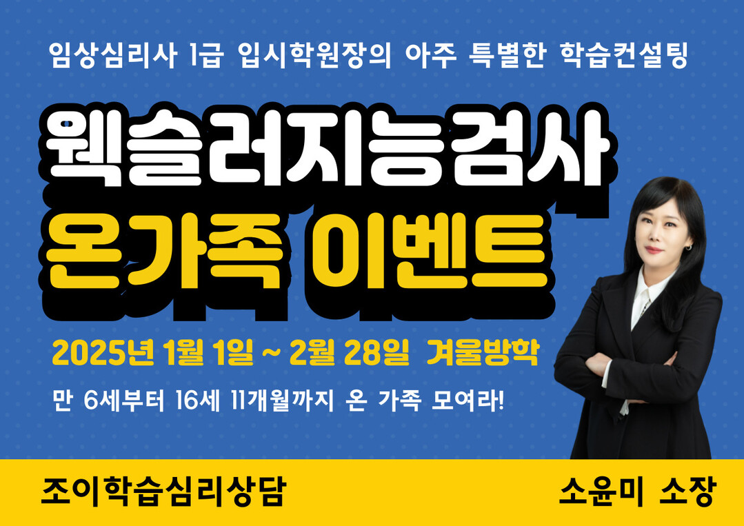 [피앤피뉴스=마성배 기자] 심리상담과 학습코칭을 최초로 접목한 교육 상담 전문 기업 조이학습심리상담(소장 소윤미)이 겨울방학을 맞이해 ‘웩슬러 지능검사(Wechsler Scale of Intelligence)’를 바탕으로 온 가족 학습컨설팅 이벤트를 실시한다고 밝혔다.