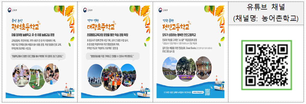 이해숙 교육부 학생건강정책국장은 “최근 농어촌 학교에서 지역 특성을 살린 창의적인 교육과정이 활발히 운영되고 있다”며 “더 많은 학교가 참여해 각 지역의 교육 가능성을 보여주고, 우수 사례가 널리 공유되길 기대한다”고 밝혔다.