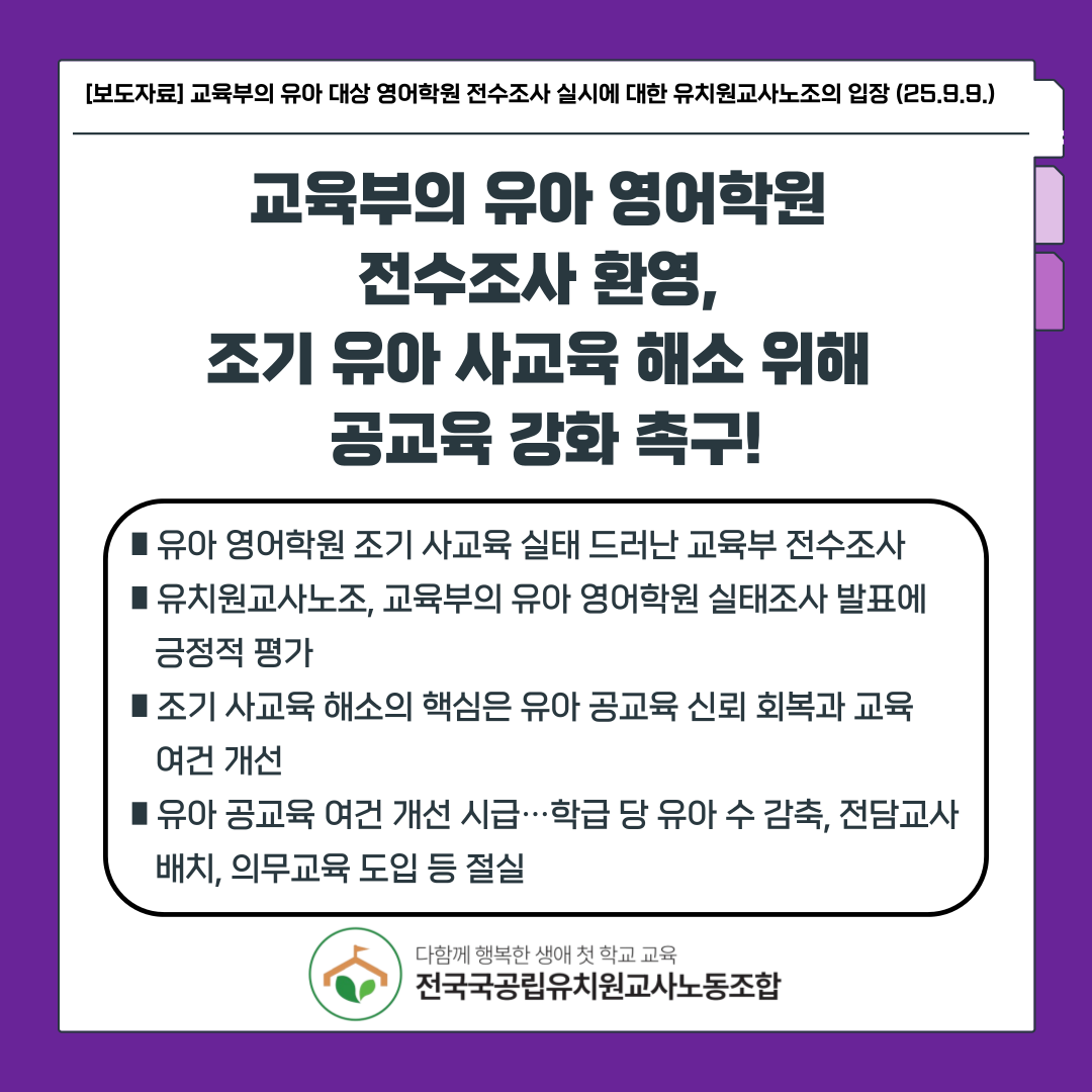 노조는 모든 유아가 발달 단계에 맞는 교육을 받을 권리를 보장해야 한다며, 놀이 중심 교육과 양질의 학습 환경 조성이 필수라고 주장했다. 특히 유아 공교육이 내실화될수록 학부모들이 조기 사교육에 의존할 필요가 줄어든다고 설명했다.