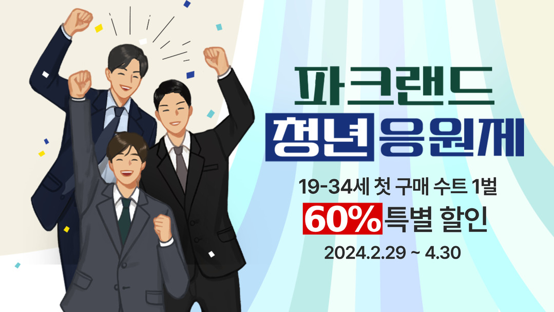 ‘청년 응원제’는 이제 사회에 첫걸음을 내딛는 청년들을 응원하고, 새로운 도약을 지원하기 위해 ㈜파크랜드가 준비한 프로모션으로, ㈜파크랜드가 전개하는 남성복 브랜드(파크랜드, 오스틴리드) 수트를 처음 구매하는 19~34세(1990~2005년생)의 청년이라면 1벌에 한해 60% 특별 할인된 가격으로 봄 신상품 수트를 구매할 수 있다.
