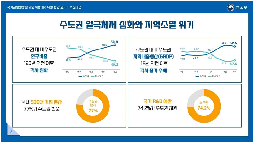 이번 논의는 지난 16일 국무회의에서 확정된 이재명 정부 국정과제에 따른 후속 조치다. 정부는 ‘모두가 잘 사는 균형성장’을 목표로, 수도권 일극 체제를 완화하고 지역 인재 양성을 위한 핵심 전략으로 ‘서울대 10개 만들기’를 추진하기로 했다. 현재 지방 거점국립대 학생 1인당 교육비는 평균 2,520만 원으로, 서울대(6,300만 원)의 40% 수준에 불과해 교육 여건 격차가 심각하다는 지적이 제기돼 왔다.