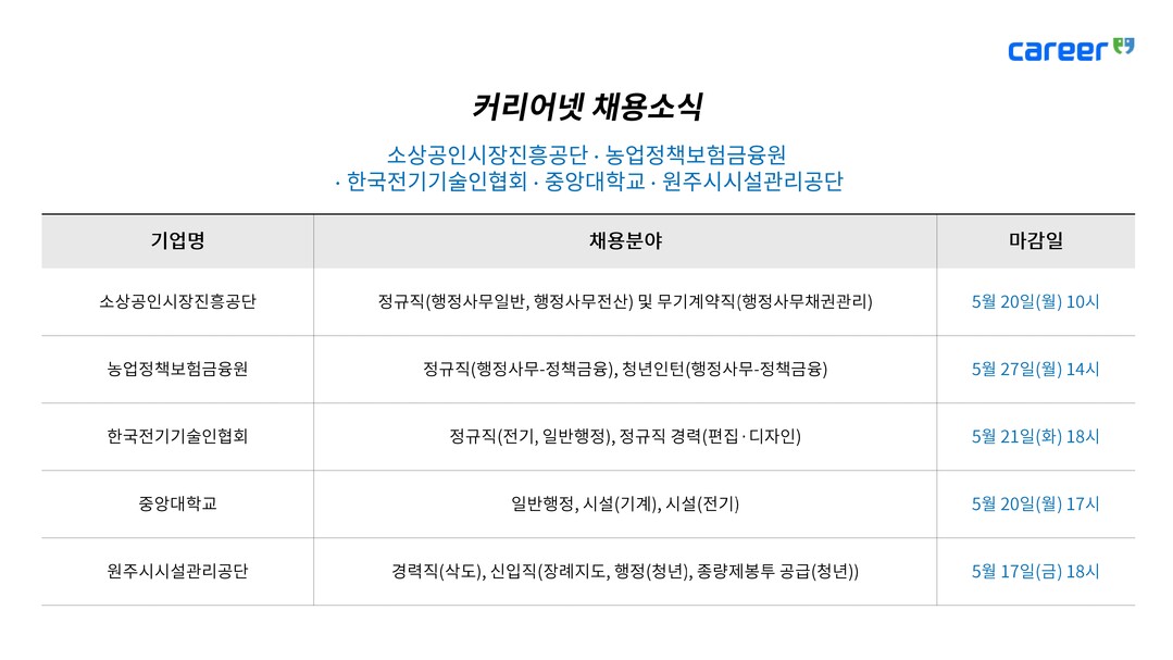 [피앤피뉴스=서광석 기자] 커리어넷이 10일 소상공인시장진흥공단, 농업정책보험금융원, 한국전기기술인협회, 중앙대학교, 원주시시설관리공단에서 신입 및 경력직 직원을 채용한다고 밝혔다.