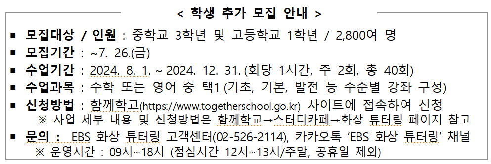 교육부(부총리 겸 교육부 장관 이주호)는 27일 사교육비 경감 및 교육격차 해소를 위해 현직 교사 및 대학생이 참여하는 'EBS 화상 튜터링' 서비스를 다음달 1일부터 무료로 운영한다고 밝혔다.