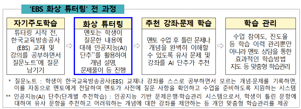 강의를 듣고 모르는 개념이나 문제를 질문노트에 기록하면, 멘토는 화상 튜터링을 통해 설명하고 효과적인 학습 방법 등을 조언하여 자기주도학습을 지원한다. 서비스는 회당 1시간, 주 2회 제공되며 올해 12월까지 운영된다.