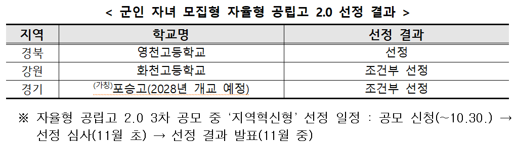교육부는 국방부와 협력해 ‘군인 자녀 모집형 자율형 공립고등학교’ 공모 결과를 15일 발표했다.