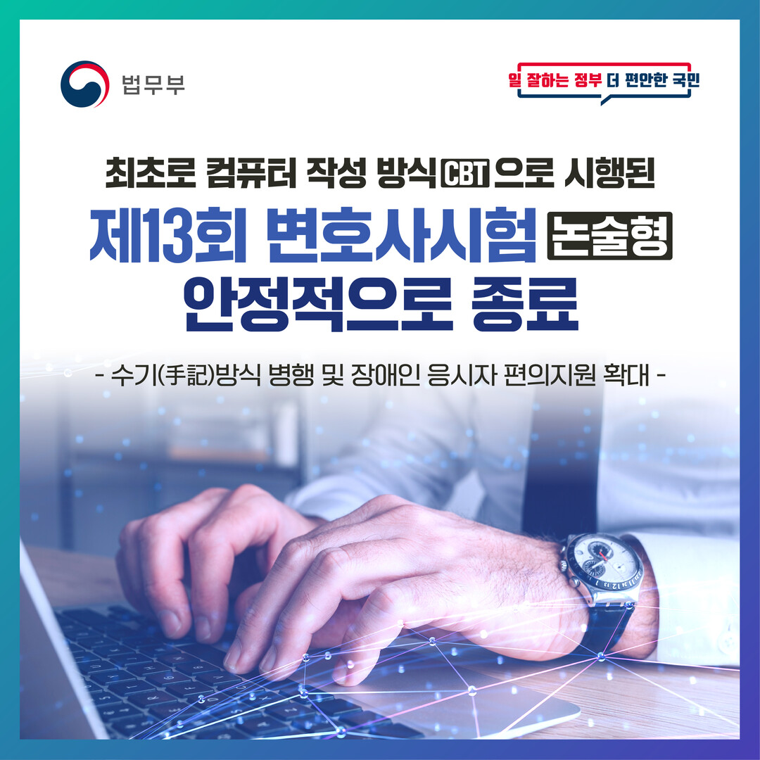 법무부는 “앞으로도 컴퓨터 작성방식(CBT)의 변호사시험이 보다 안정적으로 정착되어 응시자.시험위원 등의 편익 증진과 더불어 변호사시험의 공정성에 대한 국민신뢰 제고를 위해 최선을 다하겠다”라며 “또한, 수기 방식 신청자와 장애인 등 소수 응시자가 불편함 없이 시험에 응시할 수 있도록 더욱 노력하겠다”고 전했다.