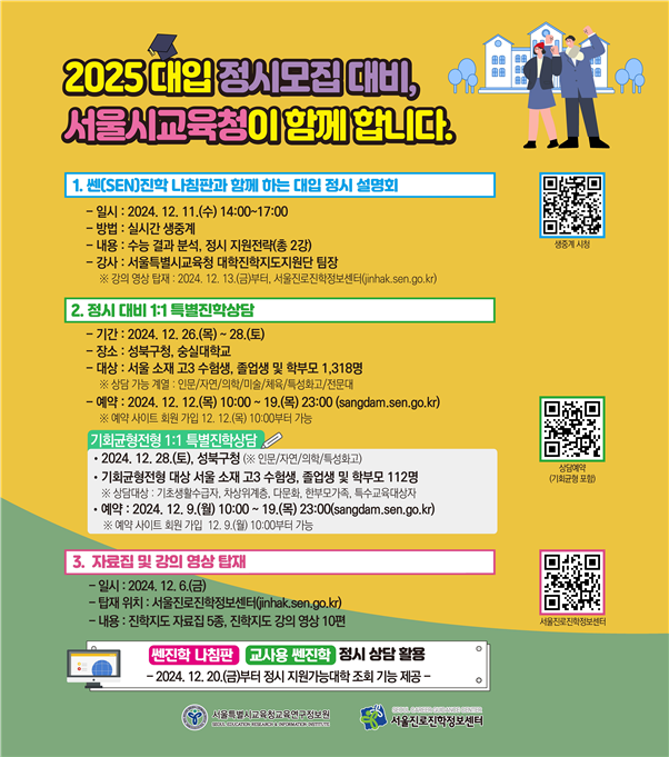 시교육청은 대입 지원을 위한 자료와 도구도 함께 마련, ‘쎈(SEN)진학 2025 대입 정시 진학지도 자료집’(5종)은 서울 관내 고등학교에 6일(금)까지 배포되며, 서울진로진학정보센터에서 누구나 다운로드받아 활용할 수 있다.