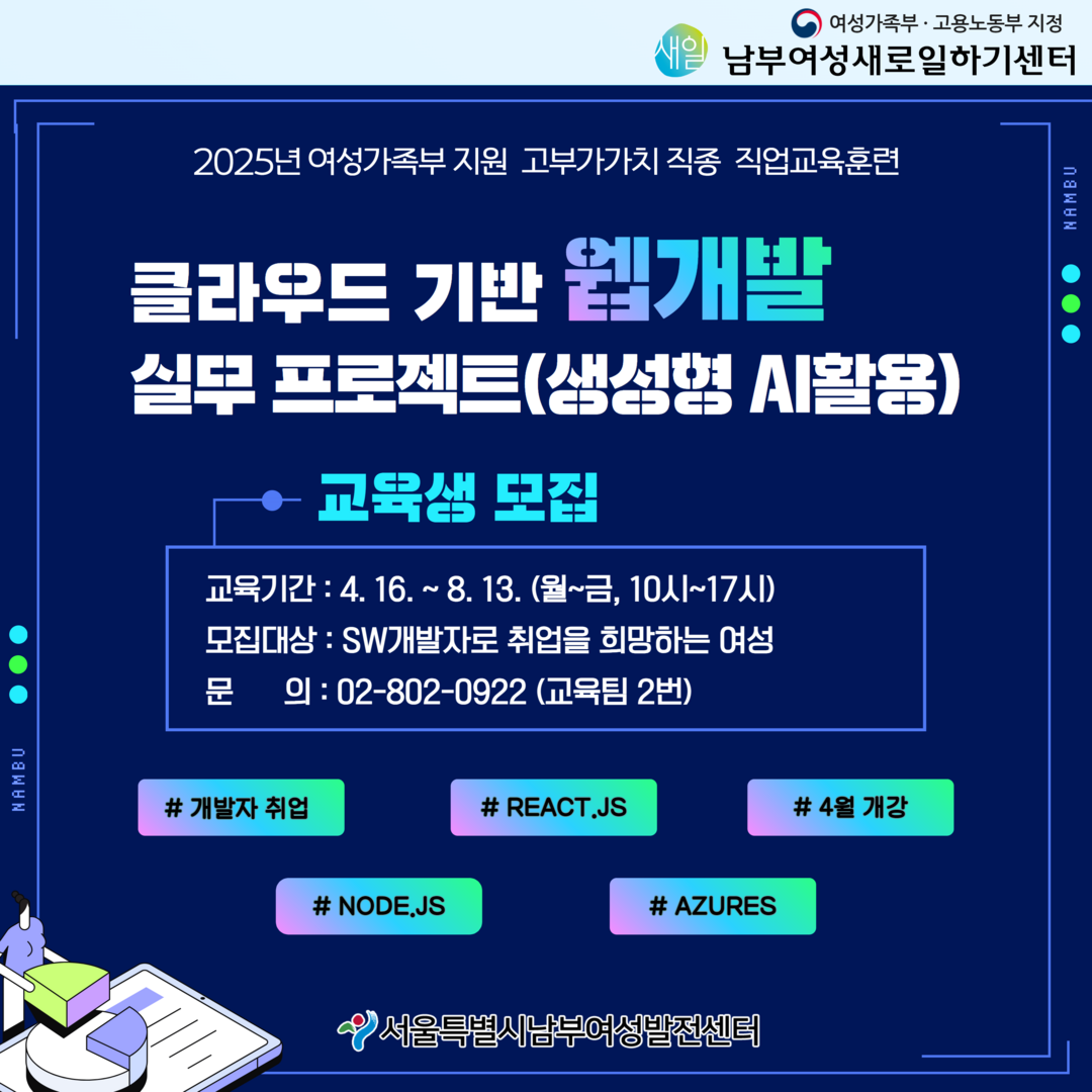 [피앤피뉴스=마성배 기자] 서울별시남부여성발전센터(남부새일센터)는 2025년 여성가족부가 지원하는 고부가가치 직종 전문인력 양성 직업교육훈련으로 ‘클라우드 기반 웹개발 실무 프로젝트(생성형 AI 활용)’ 과정의 교육생을 4월 6일까지 모집한다고 밝혔다.
