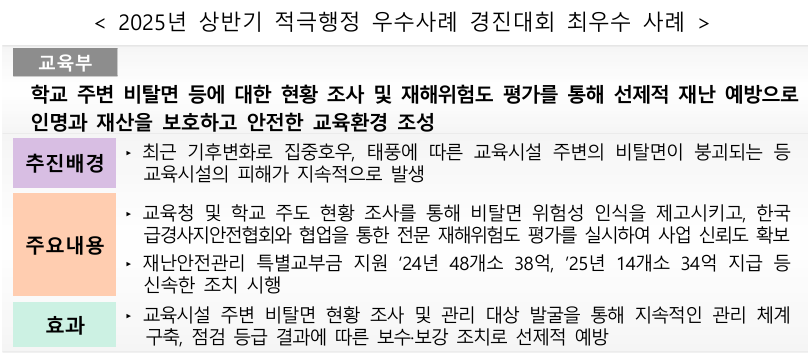교육부 최우수 사례로는 학교 주변 비탈면 붕괴 위험을 조사·평가해 선제적으로 재난을 막은 사업이 선정됐다.