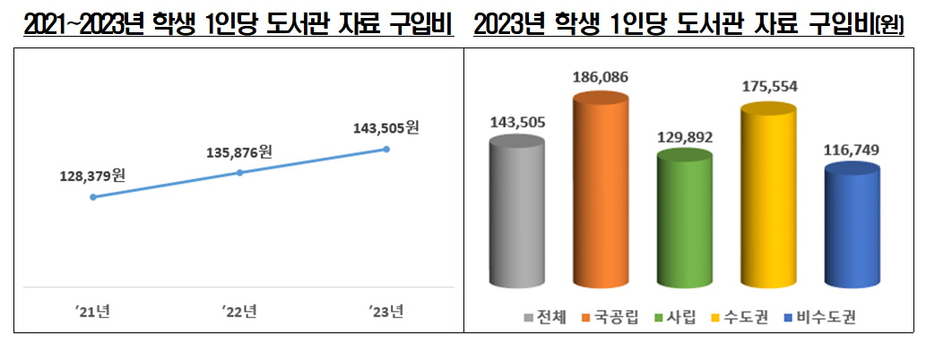 2023년 학생 1인당 도서관 자료 구입비는 평균 143,505원으로, 전년보다 5.6% 증가했다. 국공립대는 학생당 186,086원, 사립대는 129,892원을 지출하며 수도권의 자료 지원이 비수도권보다 높았다.