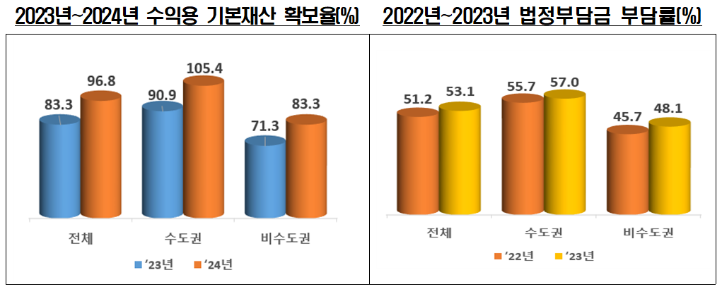 먼저, 2024년 사립대학의 수익용 기본재산 확보율은 96.8%로 전년 대비 13.5%p 상승했다. 이는 대학법인의 재정 부담을 완화하기 위해 정부가 대학설립·운영 규정을 개정한 효과가 반영된 것으로 풀이된다. 수도권 대학의 재산 확보율은 105.4%, 비수도권은 83.3%로 모두 증가했으며, 사립대 법정부담금 부담률도 전년 대비 1.9%p 증가해 53.1%에 이르렀다.