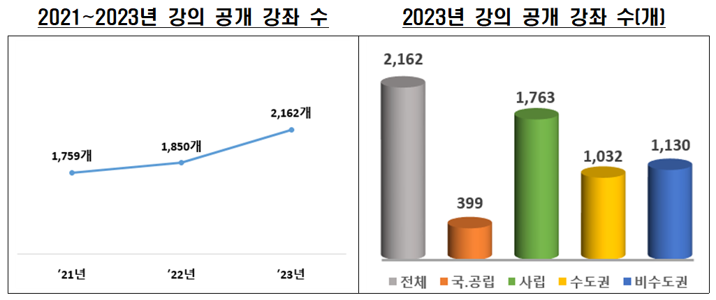 2023년 대학 강의 공개 강좌 수는 2,162개로, 전년보다 16.9% 증가했다. 특히 수도권 대학은 강의 공개 강좌 수가 26.3% 늘어나며 비수도권의 9.4% 증가를 크게 앞질렀다. 사립대의 온라인 공개 강좌는 1,763개로 전년 대비 21.4% 증가했으며, 이는 비대면 교육 강화와 맞물린 결과로 보인다.