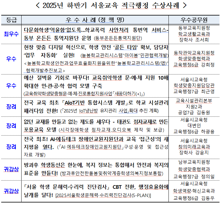 장려상에는 전국 교육 최초로 AloT 기반 통합시스템을 개발해 학교 시설관리 패러다임을 전환한 사례, 시각장애 학생을 위한 태권도 점자교재를 개발·확산한 사례, 전국 최초로 ‘AI·에듀테크 장애인교원지원단’을 구성·운영하고 접근성 자료를 제작한 사례 등 3건이 이름을 올렸다. 귀감상에는 방과후 안전 돌봄과 취약계층 학생 복지정보를 통합해 안전·복지 표준을 확립한 사례와, 서울 학생 문해력·수리력 진단검사를 CBT 방식으로 전환한 ‘S-PLAN’ 행정 효율화 사례가 선정됐다.