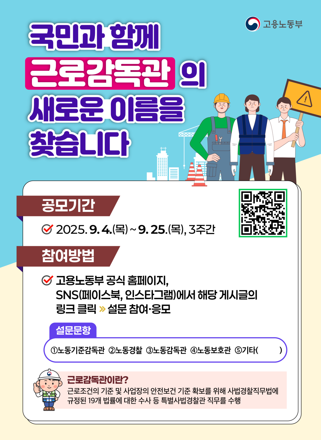 고용노동부(장관 김영훈)는 9월 4일부터 25일까지 약 3주 동안 국민을 대상으로 근로감독관의 새로운 명칭 공모를 진행한다고 밝혔다.