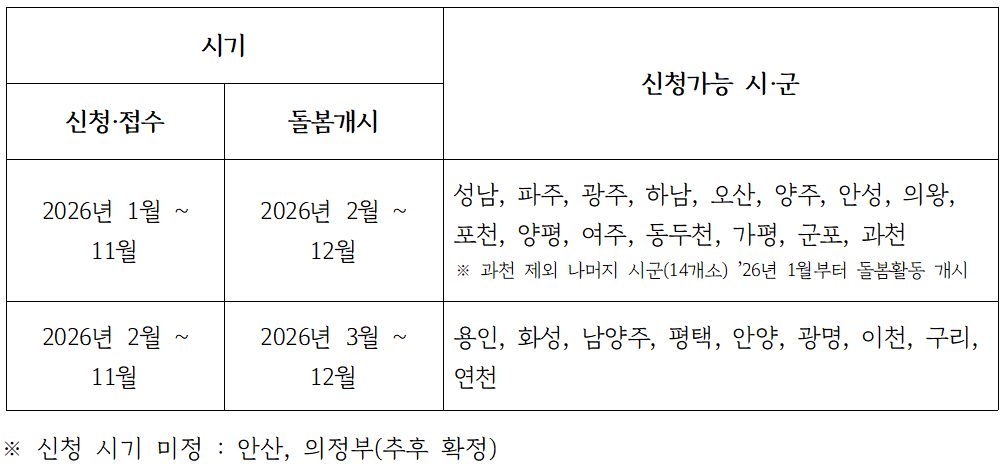 수당 신청은 매월 1일부터 15일까지 ‘경기민원24’ 누리집을 통해 온라인으로 가능하며, 실제 돌봄활동이 이뤄진 뒤 다음 달에 수당이 지급되는 방식이다. 다만 시군별 준비 상황에 따라 신청과 활동 시작 시점은 달라진다.