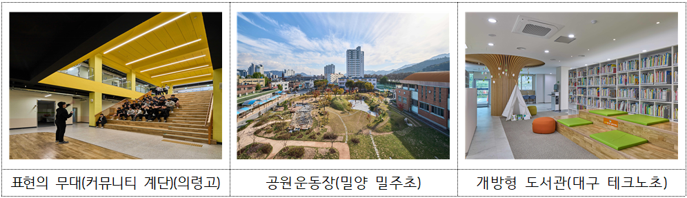 밀주초는 지역 주민과 함께 사용하는 공원을 학교 내에 조성해 공동체 의식을 강화했고, 테크노초는 개방형 학교 도서관을 설계해 학생들이 자유롭게 책을 접할 수 있게 했다. 학교미디어에듀센터는 미디어 중심의 체험 공간을 마련해 첨단 교육의 기반을 다졌으며, 수창초는 주민들에게 개방된 도서관과 시청각실을 조성해 지역사회와 소통의 장을 열었다. 마지막으로 반송초는 학생 친화형 학습 공간을 구축해 학습 환경의 질을 높였다.