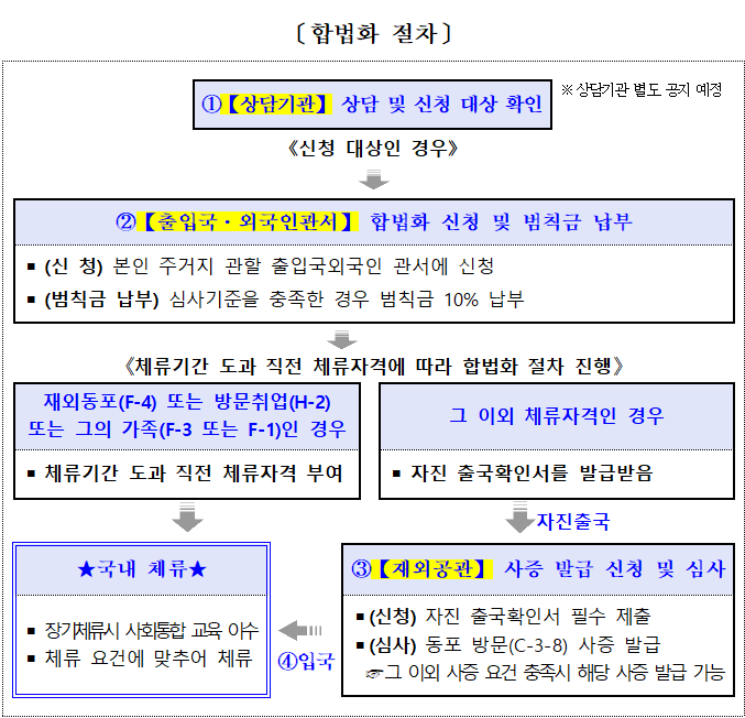 세부적인 상담기관과 구비 서류는 오는 27일부터 법무부 출입국·외국인정책본부(www.immigration.go.kr)와 하이코리아(www.hikorea.go.kr) 홈페이지를 통해 확인할 수 있다.